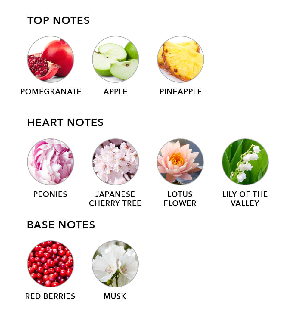 Inspired by the iconic fragrance of our best-selling Body Butter. This luxurious blend starts with the juicy sweetness of pomegranate, artfully intertwined with delicate Japanese cherry blossom, lily of the valley, and a hint of musk, creating a fragrance that is both cheerful and timeless.